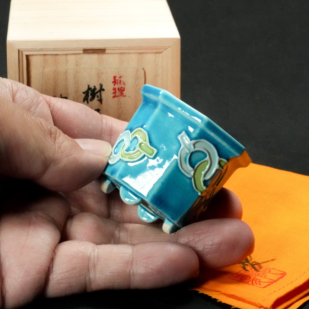 透き通るような釉薬に、浮き彫りの技法が重なり、小ぶりながらも圧倒的な存在感と華やかさを放ちます。