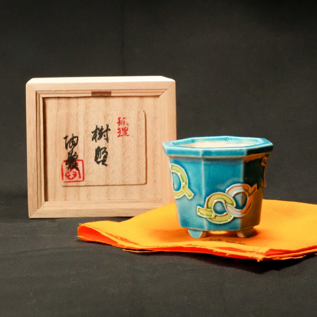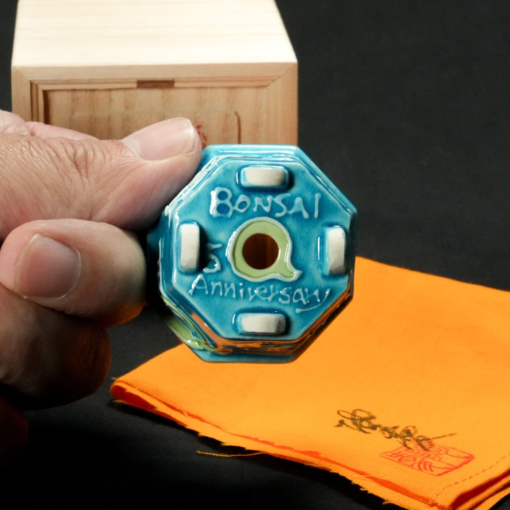 「盆栽Q」の開設5周年を祝し、陶愛氏に制作を依頼したスペシャルエディションの盆栽鉢です。