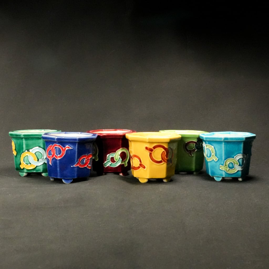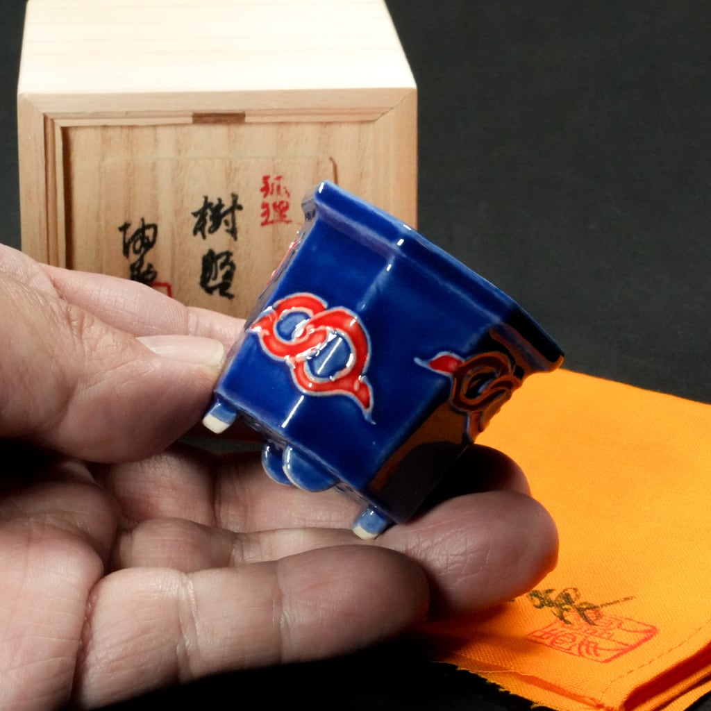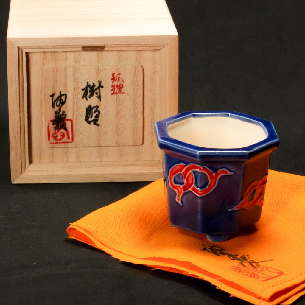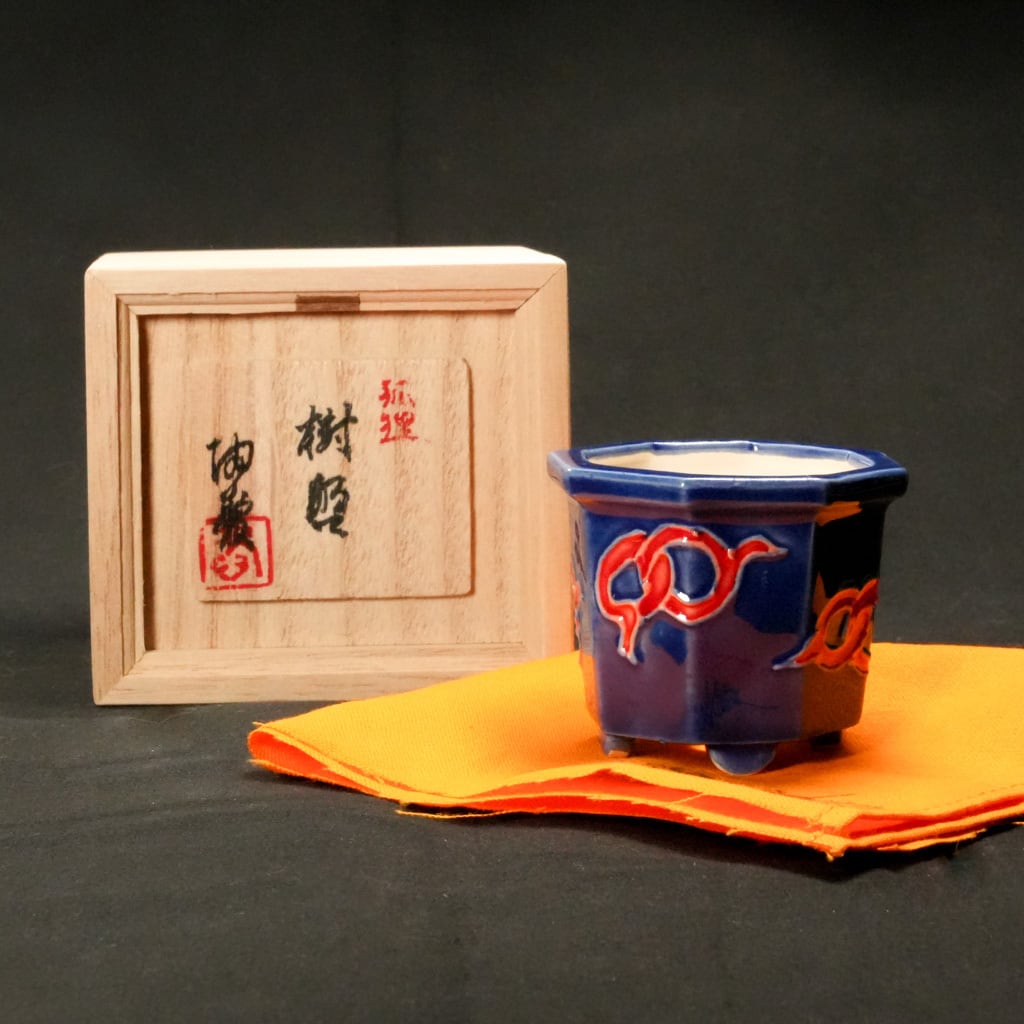 「盆栽Q」の開設5周年を祝し、陶愛氏に制作を依頼したスペシャルエディションの盆栽鉢です。